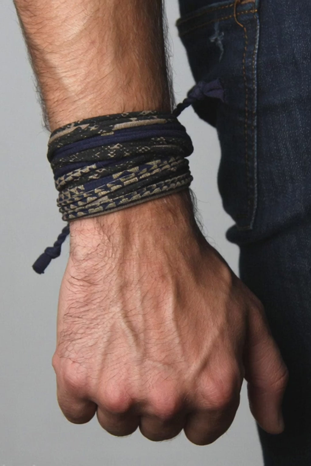 A unisex multi-strand Blue Tan Gold Mens Bracelet. Cotton jersey w/ screen prints & antiqued brass finishings. Fits up to a 7.5 inch wrist. This comes with a drawstring gift bag.